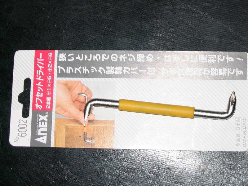 この曲がったドライバーの使い方は、立てて使うのではなくて、横に寝かせて使います。ネジのへこみが横に向いている間は、左右どちらかからまっすぐなドライバーで回せますから、溝が丁度横から回せない位置になったところを、この曲がったドライバーを横に寝かせて使って、溝に合わせてネジを回します。