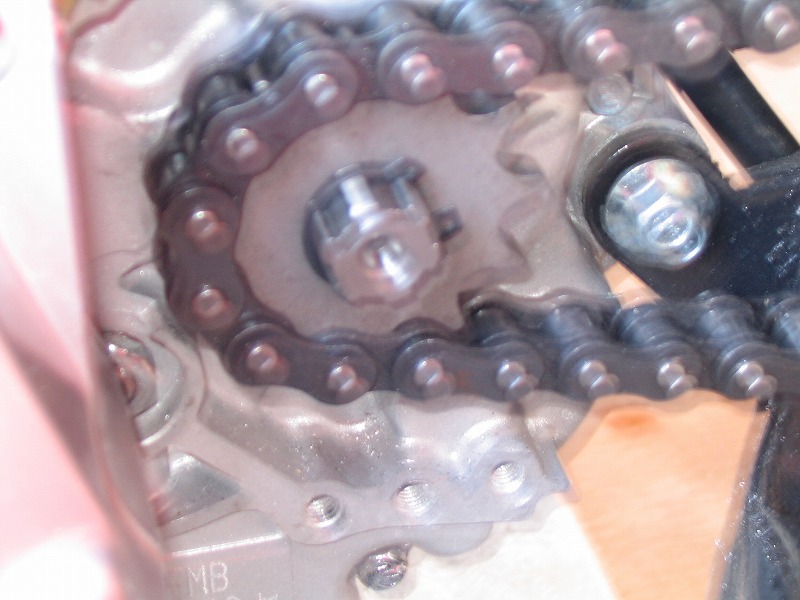しかし、動いてしまうかどうか分からなくても、とりあえず奥側にも取り付けてみればいいものを、「奥は溝がないからどうやってつけるんだ」と、分からないまま、溝の位置だけに着けて試走したところ、次に確かめるためにスプロケットをはずしたときには、見事にエンジンの側の方にスプロケットが移動し、エンジンがチェーンでこすれて削られていました。