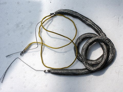 私は住宅改造用に電設用の圧着ペンチをたまたま持っていたので、両端をリングスリーブの中でステンレスワイヤの1mmと、さらに片側にはアース線も一緒に圧着して、これを作りました。