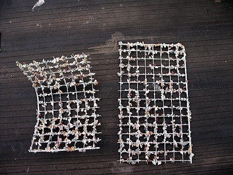 エアクリーナーエレメントの外気側にこれを置きます。100円ショップで、焼き肉用の網を買ってきてそれを適当な大きさに切ります。適当な形に整形してから、網に接着剤を付け、その上からDSEを振りかけます。接着面が小さく不安定なので、なかなかうまくつきません。ドクタ-・ルウブではコーキング材で接着と書いてありましたが、うまくいかないので普通のボンドで接着しました。でも熱など本当にこれで大丈夫なのかな。