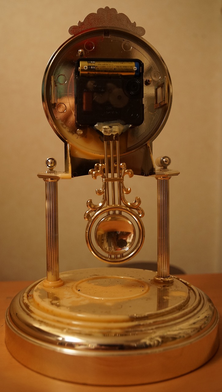 振り子がないと不恰好なので、ムーブを上下逆に取り付けて、引っ掛け部分に、振り子を貼り付けてしまいました。当然動きませんが、見かけは多少それらしく回復します。