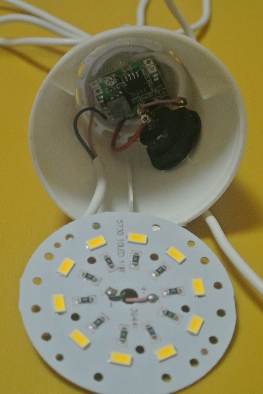 電球の根元の部分に5Vに降圧するモジュールをグルーガンで貼り付けて、そこからLEDに給電するようにしています。