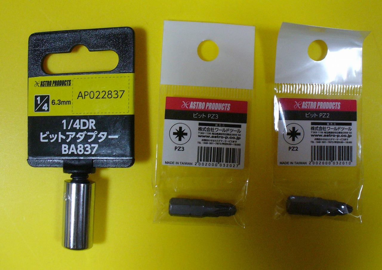 ドライバービットだけなら、アストロプロダクツでPZ1~PZ3まで、一本60円で販売しています。1/4DR ビットアダプターは150円。