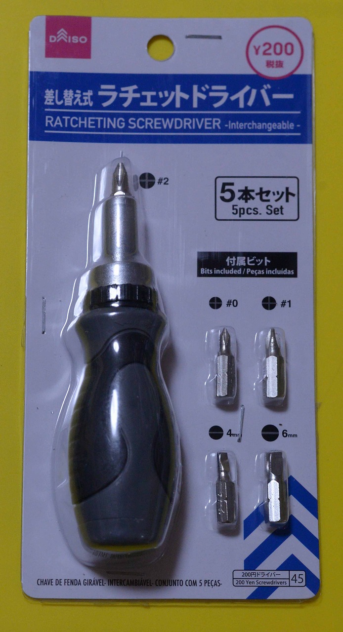 左のようなラチェットドライバーも見つけました。しかしこれは、ドライバービットを差し込んで使う分にはいいのですが、ちょっと軸が短かすぎました。