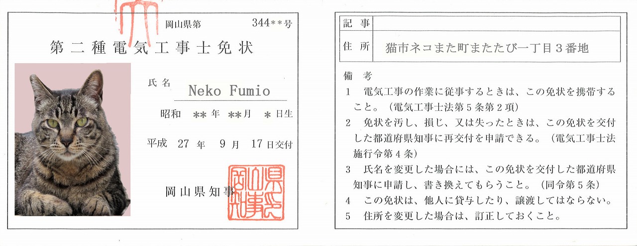 「電気工事の作業に従事するときは、この免状を携帯すること。(電気工事士法第5条第2項)」と書いてあっても、こんなもの一生は絶対にもちません。昔の大きいサイズの運転免許証入れのようなケースがついてきますが、夏場など汗をかいて作業をすれば、一発でぶよぶよになってしまいそうです。